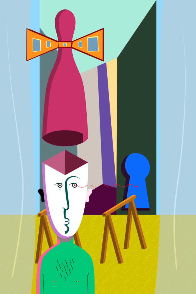 “Fast Forward” – Fine art print op aquarel papier (eigen collectie) – 150×80 cm Het idee voor deze print ontstond tijdens een gesprek met Astrid aan de ontbijttafel. We beleefden het begin van de coronapandemie, de dag nadat de eerste lockdowns werden aangekondigd. We spraken over hoe we het leven graag geruisloos vooruit wilden spoelen, zodat niemand de komende periode zou hoeven doorstaan.